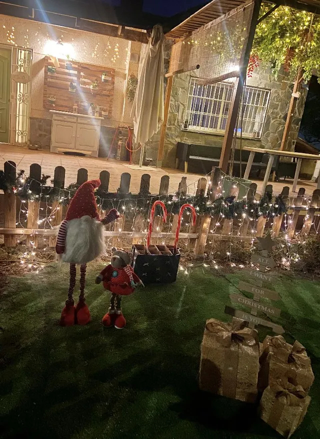 Mientras seca la pintura y el barniz, colocamos una guirnalda de exterior en la valla y añadimos también una cortina de luces a la misma valla. Decoramos con un par de gnomos. Y ya podemos añadir nuestro soporte de bastones de caramelo y nuestro arbol. En esta ocasión he reciclado el pack de regalos luminosos del año pasado.