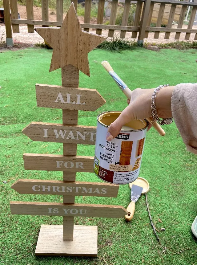 A continuación creamos el árbol de navidad. Solo necesitaremos listones de madera, cola y barniz de exterior.
