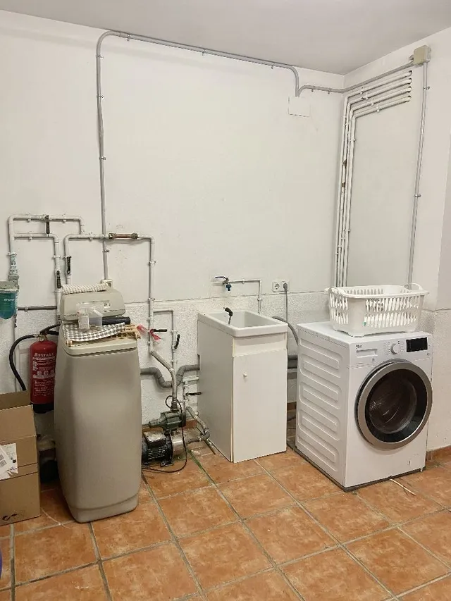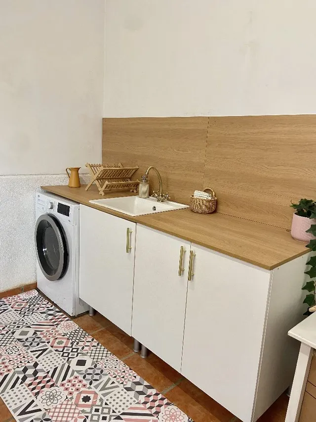 Tantas, que os comparto un adelanto, ya que todavía está sin acabar. Se trata de mi nuevo lavadero. En el garaje teníamos la lavadora con el descalcificador y un jaleo de tuberías... Hemos rehecho toda la instalación de agua para que quede oculta y nos hemos puesto manos a la obra:.