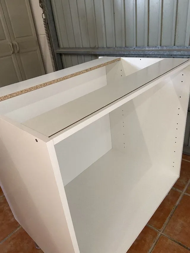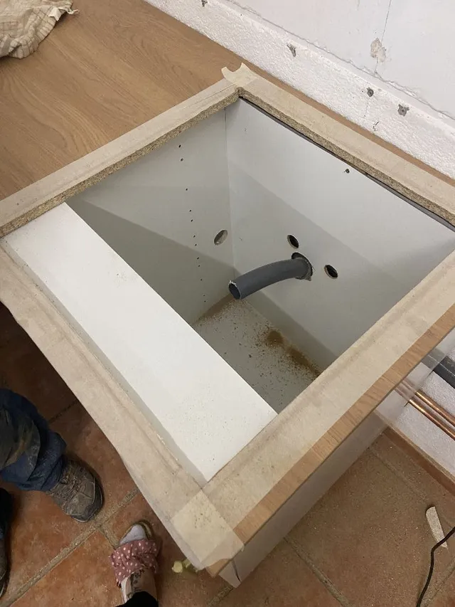 3- Elegimos unos tableros de madera en color roble a modo de encimera y cortamos el hueco donde irá instalada la pica.