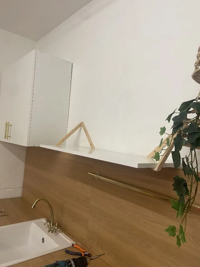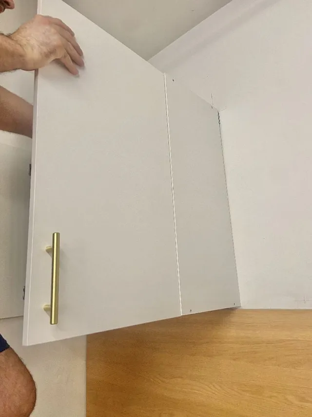 Ahora faltaba instalar un mueble doble alto y una estantería. Elegimos el mueble de la misma gama que los anteriores, que son los armarios de cocina BASIC. Y cambiarle los tiradores a estos dorados que me parecen preciosos: