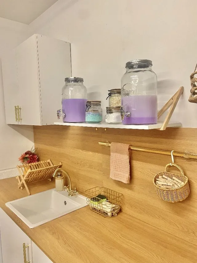 Muy acorde con la tonalidad empleada en el conjunto del lavadero. Y ahora tocaba ponerlo bonito: tapar el tubo que baja toda la instalación eléctrica con unos maceteros, colocar una barra dorada para colgar de ella las pinzas de la ropa y el trapo, colocar el cesto de la ropa de bamboo y usar estos dosificadores de detergente en lugar de los típicos envases del súper: