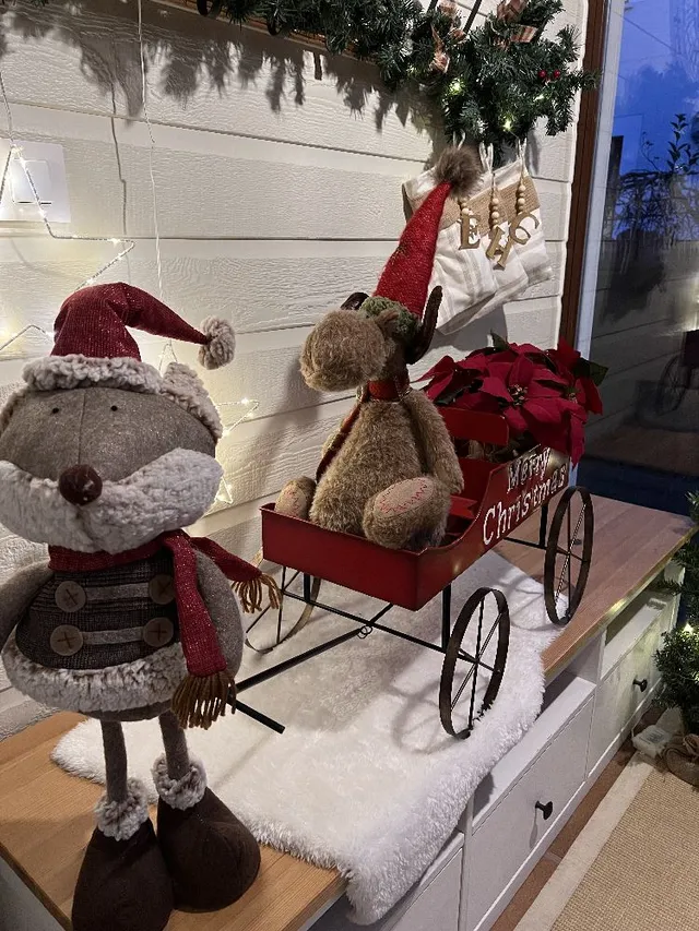 En la entrada tambien he puesto una guirnalda verde con algunas bolitas en el perchero que teniamos. y para terminar hemos puesto los muñecos con el carrito navideño y unas plantas. Esto no descarto irlo moviendo por la casa para irlo disfrutando en cada estancia.