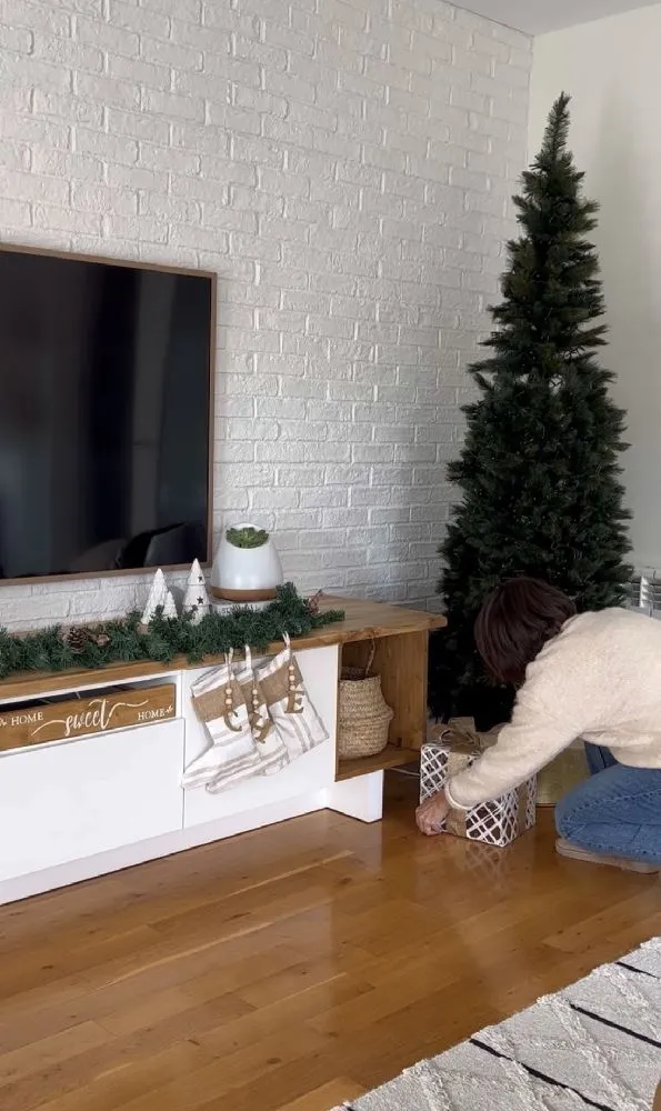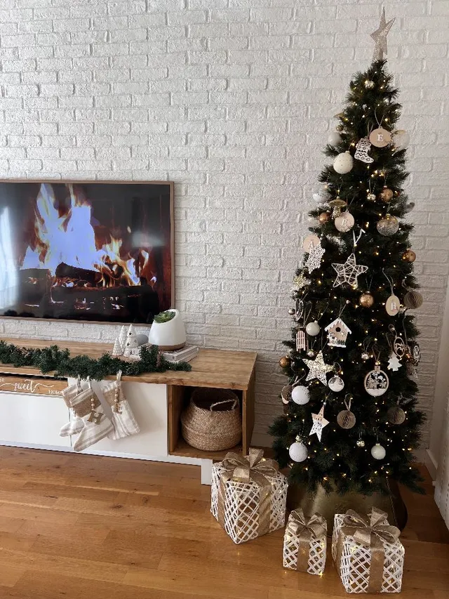 Y ya en el salon, ponemos un arbol grande como protagonista. Seguimos poniendo muchas luces. Para mi esto en navidad es un imprescindible. A los pies del arbol, he elegido unos regalos que van a pilas y los puedes encender cuando quieras, vienen los tres en un pack. en el mueble de la tele he incorporado otra guirnalda con luces y unas botitas que hice el año pasado.