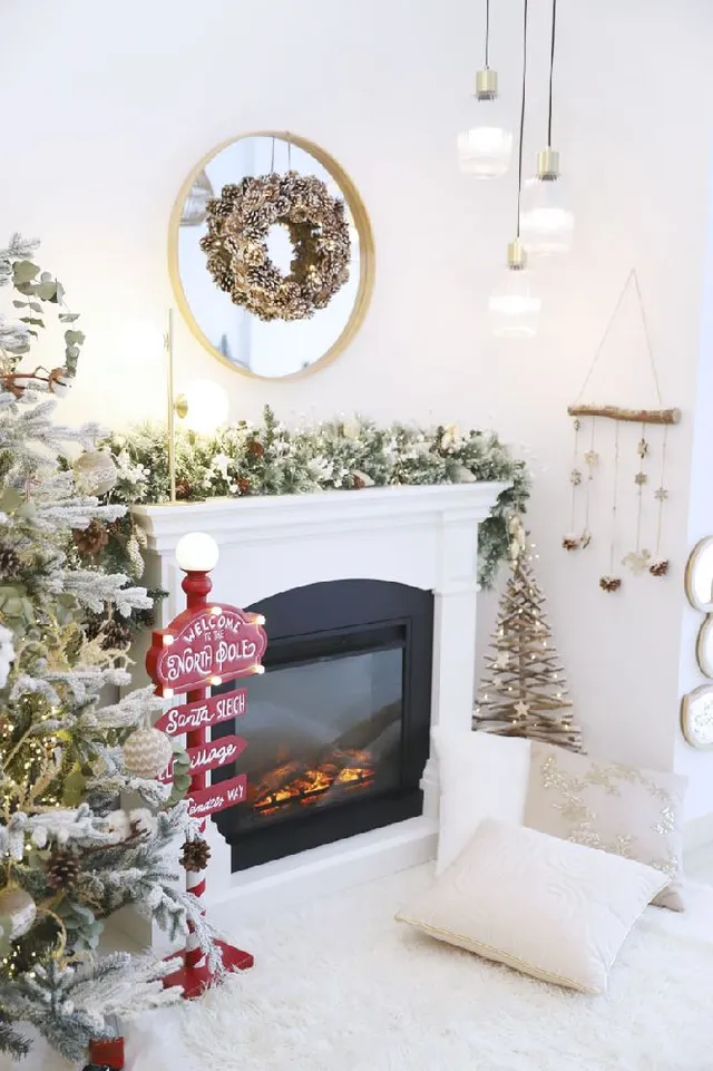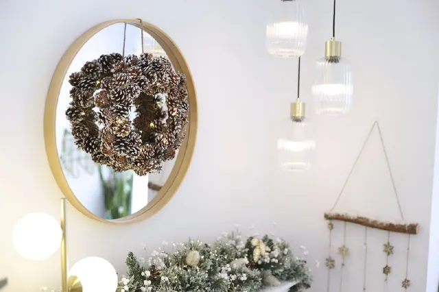 Encima de la chimenea, hemos puesto un espejo circular con el marco de madera que le da más amplitud al espacio, y que nos servirá para reflejar, aún más, las luces navideñas y de las lámparas. Sobre él, una corona de piñas nevadas y luces le da un aspecto muy natural. Para colgar la corona sobre el espejo, hemos enganchado la cuerda al tornillo al revés de como se haría si fuésemos a colgarla a ella sola, es decir, de abajo hacía arriba y mientras la sujetamos en lo alto, colgamos el espejo. De este modo, una vez que ya hemos colgado el espejo, la corona colgará sobre él.