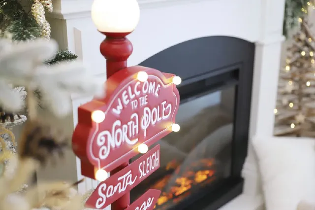 Algo que no puede faltar en un rincón navideño cuando hay niños en casa un tren bajo el árbol y una señal metálica con luces que es sin duda, la estrella de este espacio.