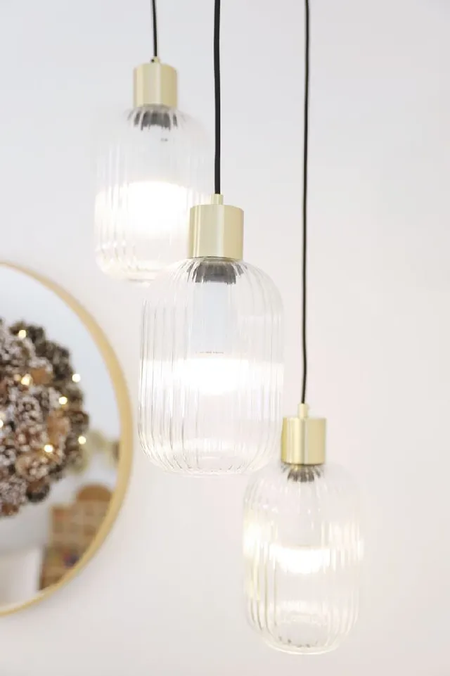 En esta época navideña e invernal, siempre me gusta añadir diferentes toques de iluminación, ya que nos dan un toque cálido y acogedor, así que hemos incorporado una lámpara de mesa y otra lámpara colgante con tres luces en el lado opuesto. Con estas dos lámparas, conseguimos hacer un "match" a cada lado. Con la lámpara de mesa damos verticalidad y con la lámpara colgante rellenamos el espacio aéreo con luz y decoración liviana.