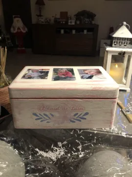 Buscamos 3 fotos que representaran a la pequeña Laia, y las imprimimos en impresora laser. Las recortamos y preparamos para poner el transfer sobre la foto para posteriormente transferirlo a la tapa del baúl y terminar el proceso.