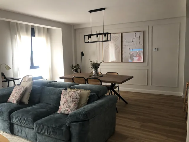 Lo primero que hicimos fue tomar medidas de la pared y hacer un diseño de las molduras teniendo en cuenta el ancho, el alto (tanto del rodapié como de la viga), el enchufe que hay, el termostato y los cuadros que ya teníamos. Queríamos que todo quedase simétrico y no nos coincidiese ninguna moldura con los elementos particulares de esa pared.