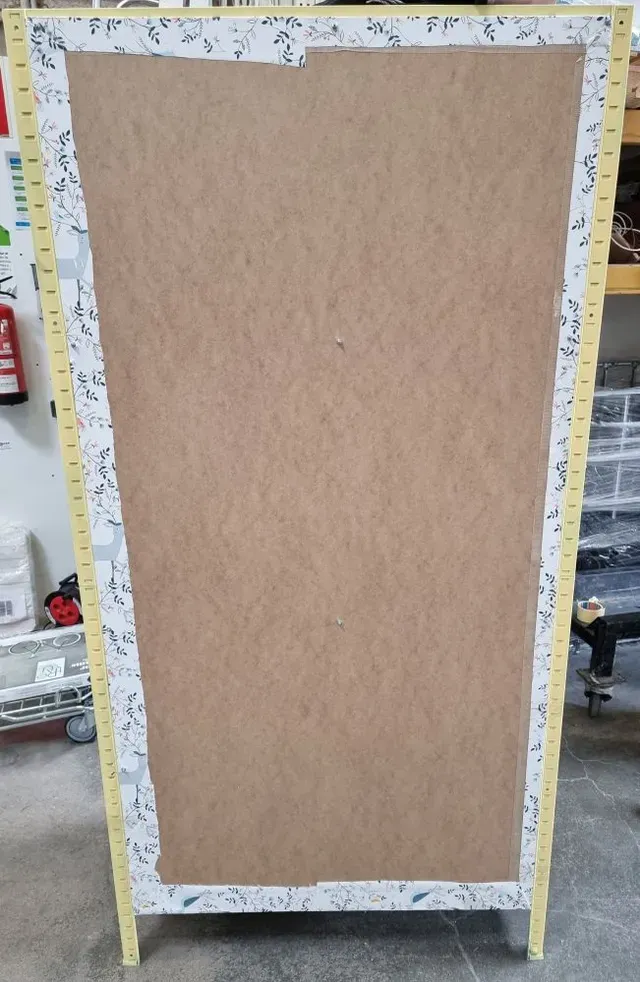 Después cogí una trasera fina, y la enpapelé con el papel infantil de esta temporada que es ideal. Con unos tornillos de roscachapa anclé la trasera a la estantería