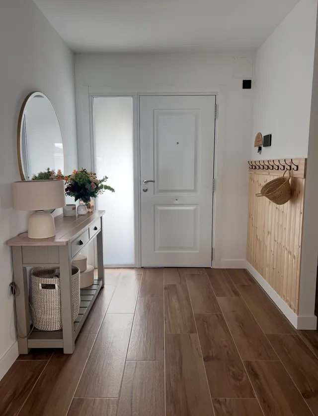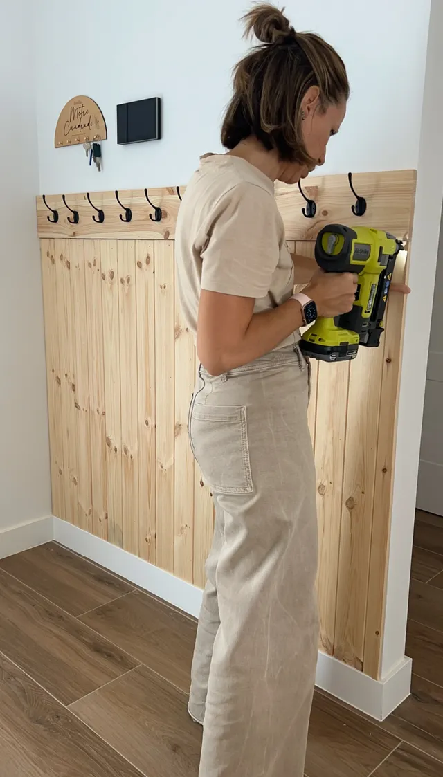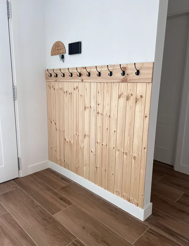 El tablon de madera con los ganchos ya los tenia pero veia muy sosa la pared. Asi que decidi instalar un friso.