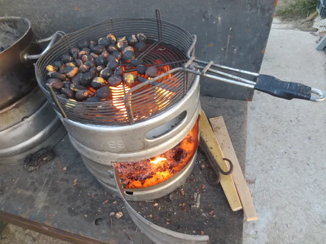 Asador de castañas. Con un asador de castañas.