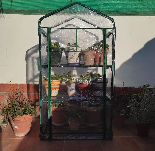 En el Leroy Merlin hay unos invernaderos estupendos para las macetas, y para que no le caigan heladas, a parte también por si quieres sembrar maceteros de fresas.