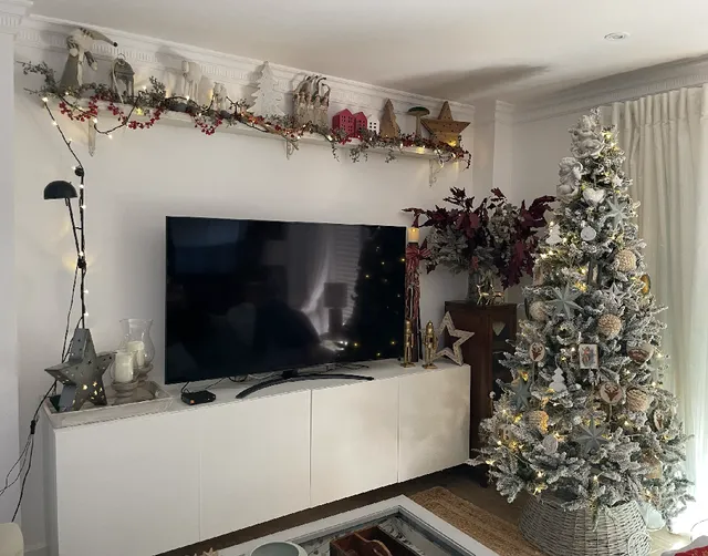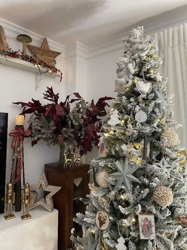 Este es el segundo año que decoramos el árbol nevado de Leroy Merlin, su altura y diametro son ideales para el espacio que reservamos todos los años para su montaje; los adornos son recuerdos de toda la vida y se han actualizado con pinturas a la tiza, y las luces, que con el cableado blanco se integran entre las ramas a la perfección.