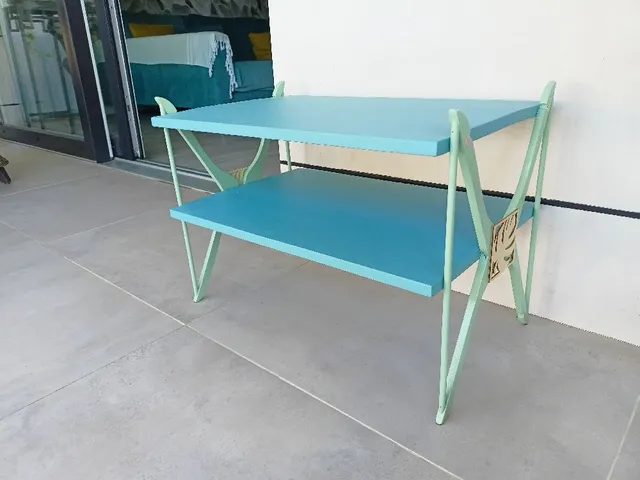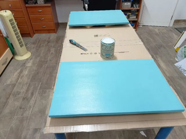 Con las baldas ya preparadas, las pintamos con pintura a la tiza para exterior en color azul profundo. Le dimos tres capas, pasándole un papel de lija superfina (320 pp) suavemente entre capas.