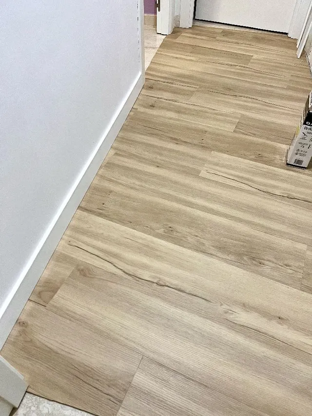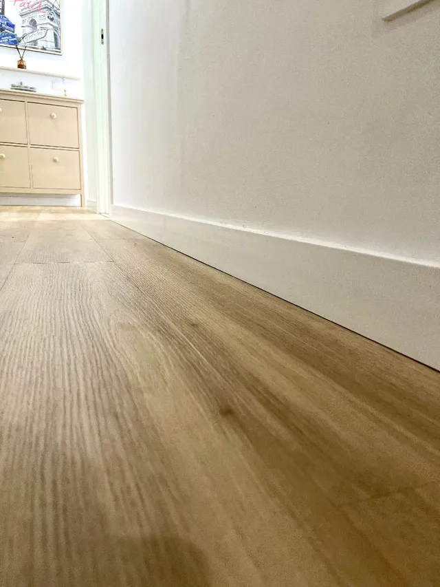 Aquí os enseño lo torcido que pusieron mi suelo en el pasillo, no soy profesional y entiendo que dependerá del tipo de suelo, del ancho, de quien te lo ponga... pero visualmente era mejor no mirar lo torcido que estaba.