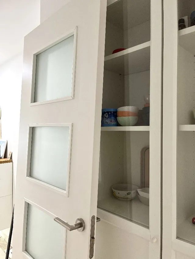 Tuvo que quitar la puerta que va del pasillo al salón que es la de la foto, la del aseo (cocina y baño no porque son correderas), y la de las tres habitaciones del fondo. Así estuvimos unos cuantos días, cada puerta en su habitación y la otra en el pasillo, fue muy divertido ;) es lo que tiene que lo haga a ratos (por el trabajo) una sola persona, esto no es llegar y besar el santo.