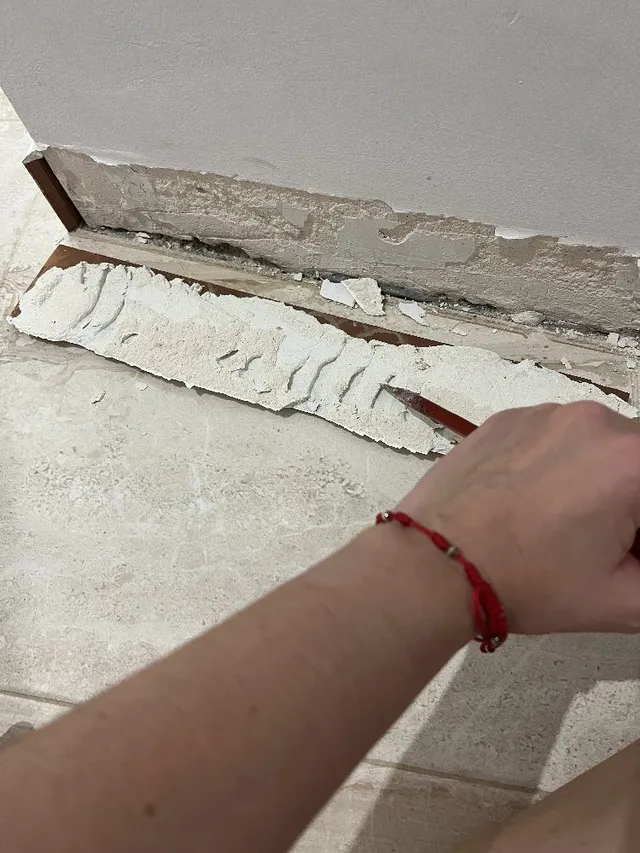 •Lo primero de todo es limpiar bien el suelo y dejarlo limpio de polvo. Empezamos a quitar los rodapiés, en nuestro caso con un destornillador haciendo palanca y dándole golpes con un martillo de goma.