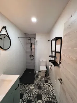 Por último, cambiamos la columna de ducha y el grifo del lavabo. Y le dimos los últimos retoques de color a la mampara y con dos espejos a diferentes alturas. Además incluimos algunos accesorios en negro que combinaba con la grifería.