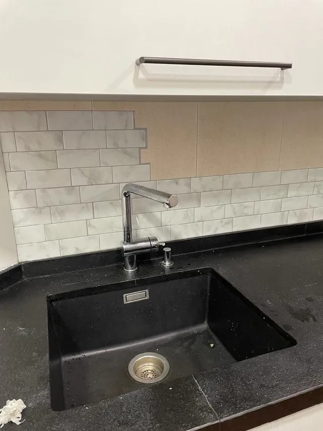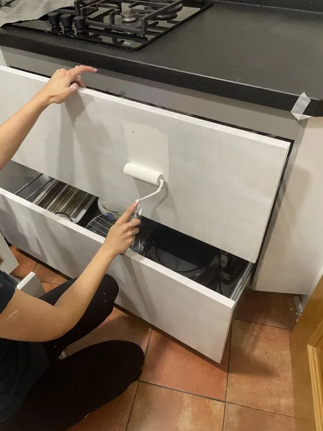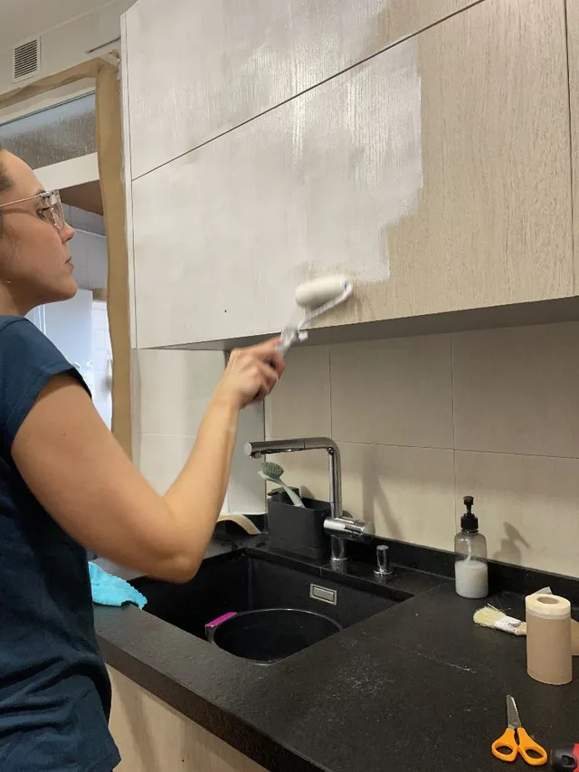 Y para los muebles, utilizamos pintura de color blanca para muebles de cocina y baño de la marca también Luxens. Igual que con los azulejos, le dimos un total de 3 capas dejando 8 horas de secado entre ellas.