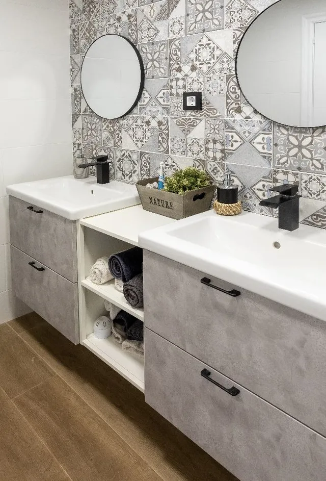 Instalamos plato de ducha de resina, ducha con chorros en negro como la grifería, espejos redondos con contorno negro, suelo cerámico imitación madera. Y en paredes, azulejos blancos combinados con hidráulicos en gris. Preciosa combinación y precioso resultado 😍