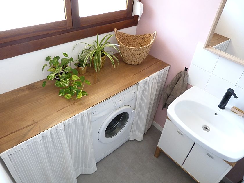 3. **Eliminar la bañera. **Hemos ganado espacio para colocar la zona de lavado. De momento solo está la lavadora pero la idea es poner la secadora a su lado. Para crear esta zona de lavabo he colocado una tabla a modo de encimera. La idea es de Rocco en mi sofá. En principio iba a colocar una encimera pero al ver como ella lo solucionó con un tablero de 10 € me pareció una idea genial. El tablero lo he envejecido con betún de judea y está protegido con un barniz en crema. Se sujeta a la pared con dos recortes del mismo tablero pegados a la pared con adhesivo de contacto Ceys Montack. Es increíble la fuerza con la que se han adherido. No pude quitarlos para dar la masilla!