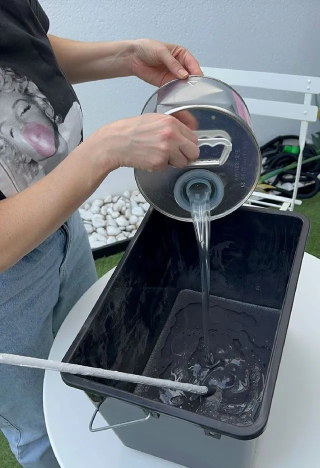 La forma de mezclarlo es muy sencillita y viene bien explicado en las instrucciones. En un cubo pones todo el colorante y un poco menos de disolvente, a fin de que puedas mezclar todo bien y te quede una pasta sin grumos. Una vez que la mezcla es homogénea, solo tienes que añadir agua - en la proporción que se indica en las instrucciones - y el resto del disolvente. A partir de ahí, solo hay que armarse de paciencia y aplicar cuidadosament el producto para que los poros queden bien cubiertos. Nosotros tardamos un par de horas por cada mano, así que me pareció poco esfuerzo para lo a gusto que te quedas :)