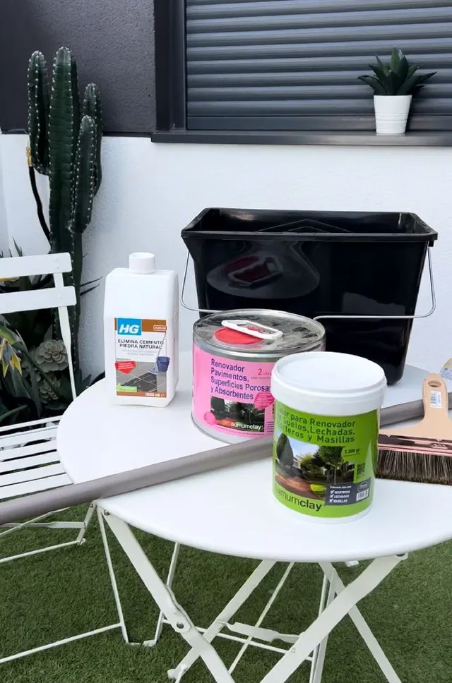 La superficie de nuestro garaje es de unos 20 metros cuadrados, así que inicialmente adquirimos dos botes pequeños de 'renovador de pavimentos" (que puede ser con base al agua o disolvente) y de colorante color cemento. Al final compramos dos para darle dos manos, así que mi recomendación es que compréis el bote grande desde el principio. De este modo no tenéis que parar a medias y no corréis el riesgo de que cambie la tintada entre la primera y la segunda mano.