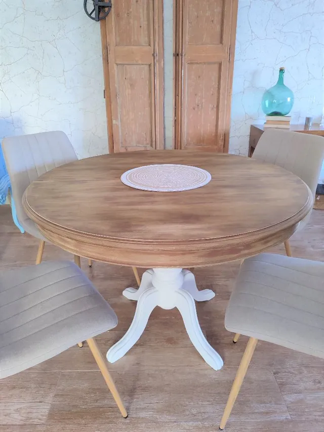 Esta mesa tenia claro que iba a ser asi, madera natural en el sobre y patas blancas.