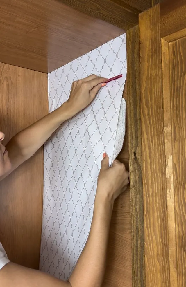 Cortamos el papel a medida y vamos pegando poco a poco sacando el aire con una espátula. Si quedan burbujas pequeñas solo debes pinchar con una aguja y sacar el aire.
