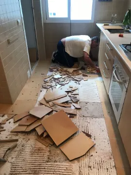 1º Levantamos las losas antiguas para dejar todo al mismo nivel con mucho cuidado de no romper las losas de la pared . 2º Ibamos a ponerlo recto pero con esta forma espiga quedo espectacular . 3º Me ha gustado tanto el suelo de artens que lo pusimo tambien en la terraza . 4º No soy profesional , lo hemos hecho casero total pero ha quedado de revista . estoy encantada con el resultado