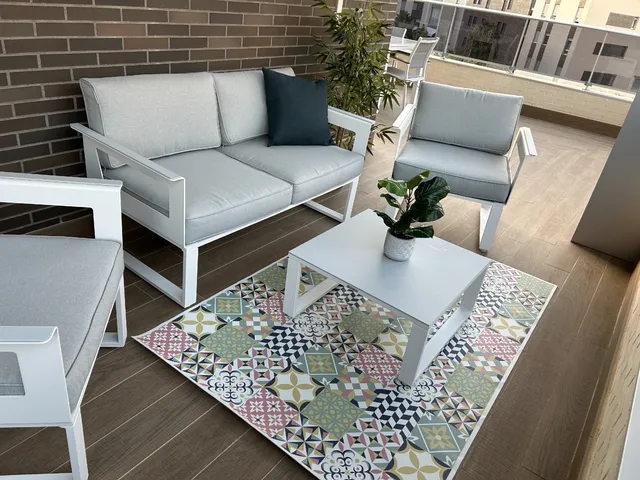 ¡El secreto está en los detalles! La alfombra vinílica no solo añade color, sino que también unifica el espacio con su toque de diseño geométrico. Los cojines y plantas aportan ese toque extra que convierte una simple terraza en un lugar perfecto para relajarse o recibir amigos.