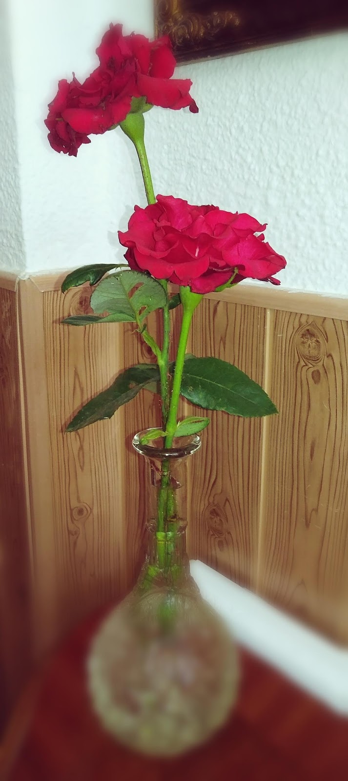 Y por último y dando el toque de color, unas sencillas rosas rojas, dentro de una botella que encontramos tirada en un vertedero, y que tiene unas uvas talladas en el cristal. Sencillamente preciosa.