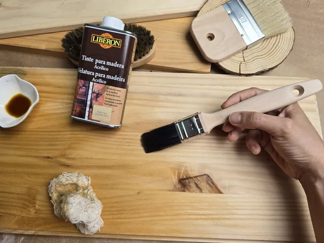 Para cambiar el color de la madera puedes usar un tinte de base agua de la marca Liberon, que cuenta con varios colores. Esta misma marca tiene disponibles masillas para hacer pequeñas reparaciones, si fuera necesario. No olvides la lija para igualar la superficie antes del cambio de color. Para aplicar el tinte, utiliza una brocha y muñequilla (hilos de algodón). Una vez teñida la madera puedes protgerla con cera incolora, si no quieres modificar el tono, o con color si quieres añadir un nuevo matiz de color.