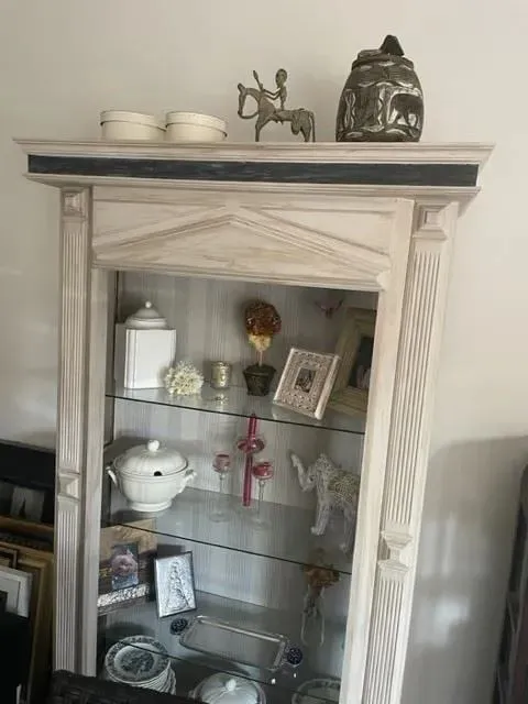Esta vitrina antigua era color madera y la he pintado con pintura a la tiza para que se integrara un poco más con la pared y pasara más desapercibida.