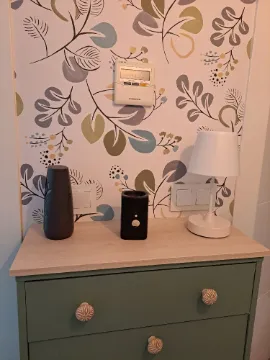 El primer paso es limpiar bien y una capa de imprimación. la he dejado secar un día y he puesto una mano de pintura de color verde oliva y dejar secar un día. Poner una segunda mano de pintura y cuando ha secado he puesto los pomos y he comprado la leja a medida en Leroy. Ha sido muy fácil y creo ha quedado bonito. Espero os guste.