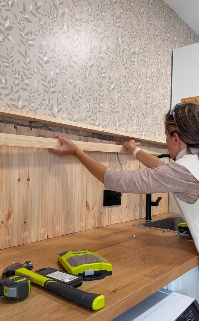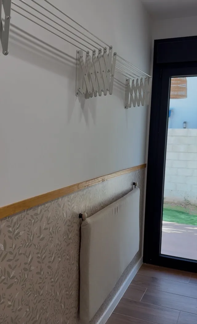y asi queda todo este lado, con tendedero extraible para cosas pequeñas encima, la tabla de planchar colgada y el papel pintado para combinar con el otro lado.