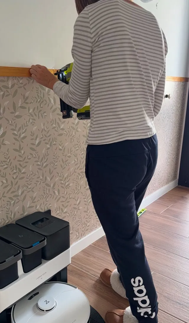 Para nosotros la distribucion ya era comoda asi que lo que he hecho es ponerla mas bonita y un poco mas funcional. Lo primero fue poner el friso. Para ello, primero puse un par de listones con taladro a la pared.