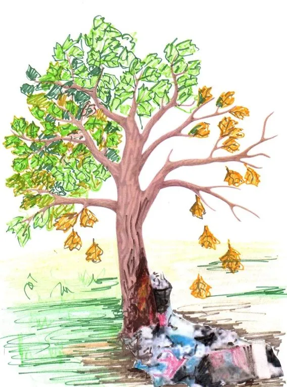 Terminaremos una escultura participativa, tendremos la posibilidad de transmitir un mensaje representativo de lo que ocurre con los residuos que acaban abandonados en los entornos naturales. Es la representación metafórica de un árbol en la naturaleza, en donde la basura amontonada ha empezado a enfermar al árbol, desprendiéndose las hojas enfermas y por el otro lado, reflejar la belleza de un árbol sano. El discurso de la obra es la representación del árbol en los entornos naturales donde hay residuos pero también la representación de la relación que mantenemos los humanos con la naturaleza y la necesidad de actuar. La obra pretende ser una llamada a la acción para cuestionarnos el impacto que generan los humanos sobre la naturaleza y mostrar las toneladas de residuos que ha conseguido evitar Leroy Merlin a través de acciones de voluntariado o estrategias de economía circular, entre otros, para devolverle la salud a los bosques. La escultura participativa se revestirá con materiales traídos por el monitor del taller recuperados de entornos naturales y por residuos que traigan los participantes de sus casas, tales como camisetas viejas, chanclas, botellas plastico, etc.